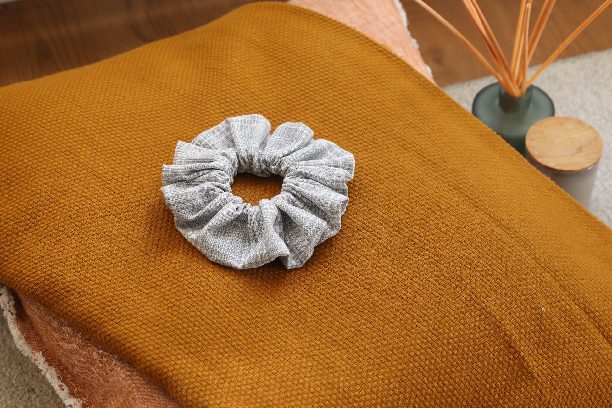 Father Figure Scrunchie: Handmade from grey tartan suiting fabric.