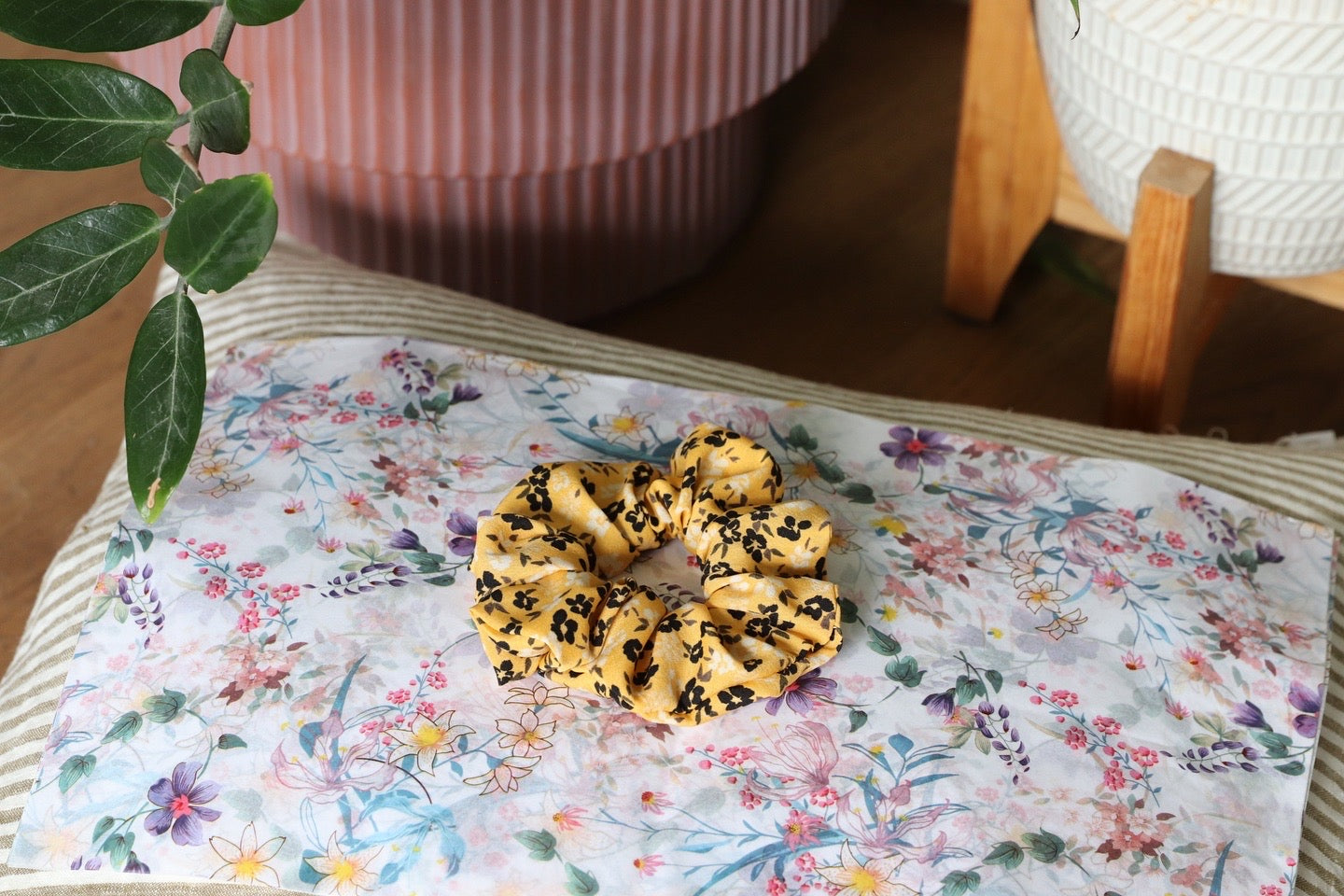 Mini Sunflower Scrunchie: Handmade from sunflower yellow printed viscose/satin blend fabric.