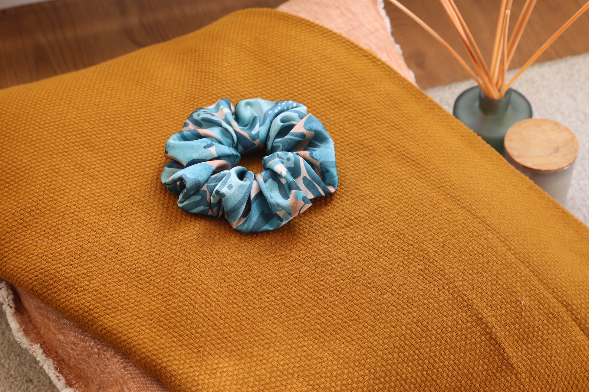 Opalite Satin Scrunchie: Handmade from teal blue/green printed satin fabric.