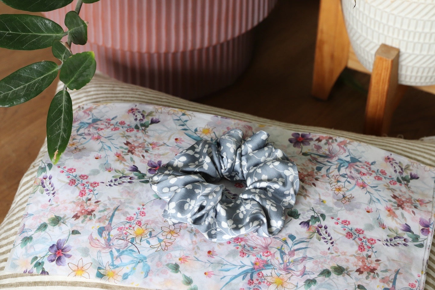 Summer Skies Scrunchie: Handmade from dusty blue floral silk fabric.